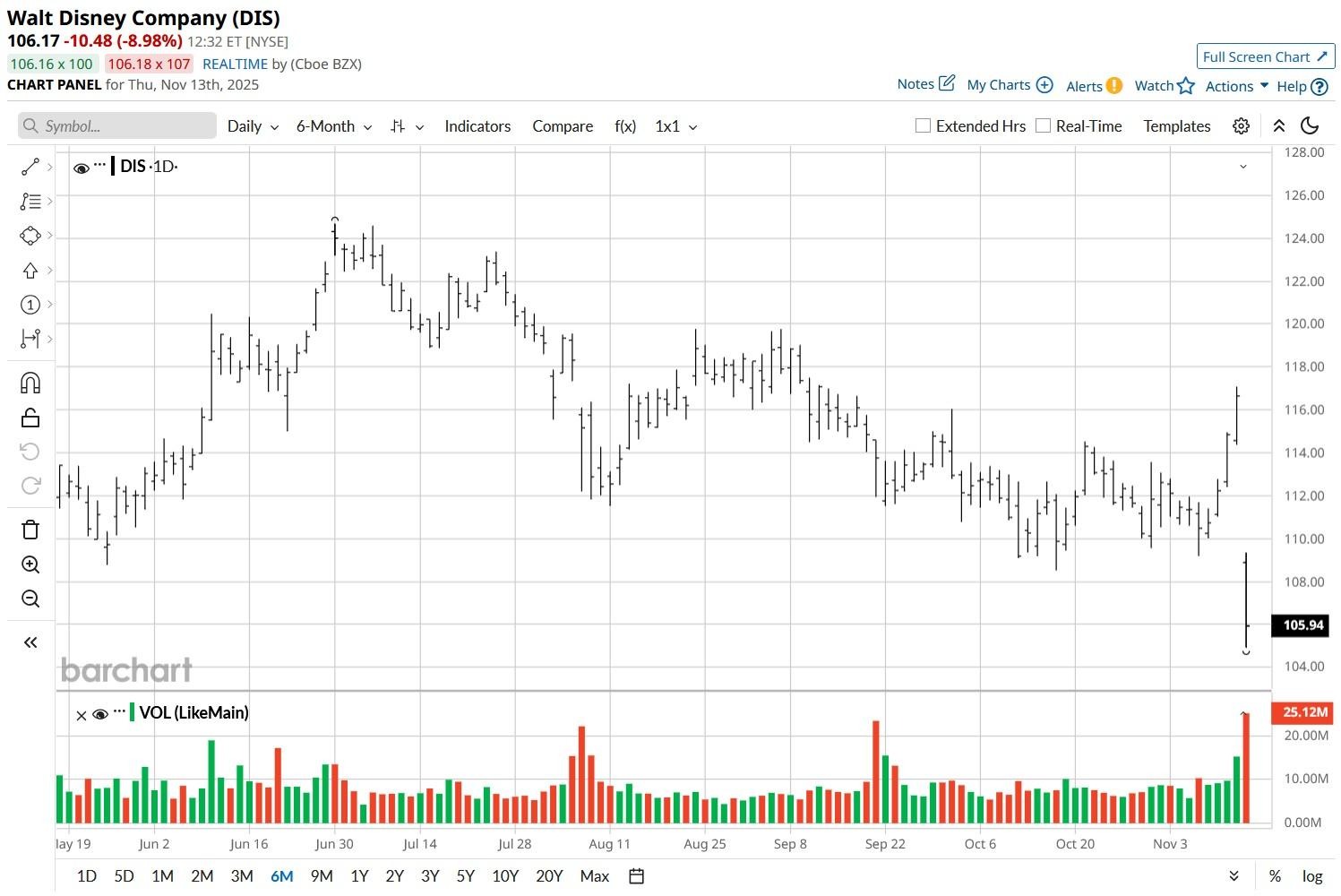 Shares of the entertainment and mass media behemoth lost as much as 10% on Thursday morning, breaching a key support coinciding with their 200-day moving average (MA) at the $110 level.