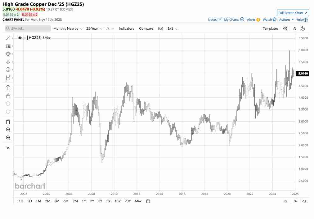 The twenty-five-year monthly continuous COMEX copper futures chart highlights the pattern of higher lows and higher highs since copper futures traded at a November 2001 low of 60.40 cents per pound. Despite the volatile price action in 2025, which took copper futures from a January low of $4.0050 to a July high of $5.9585 per pound, the long-term bullish trend remains intact with copper trading above the $5.00 level on November 17.