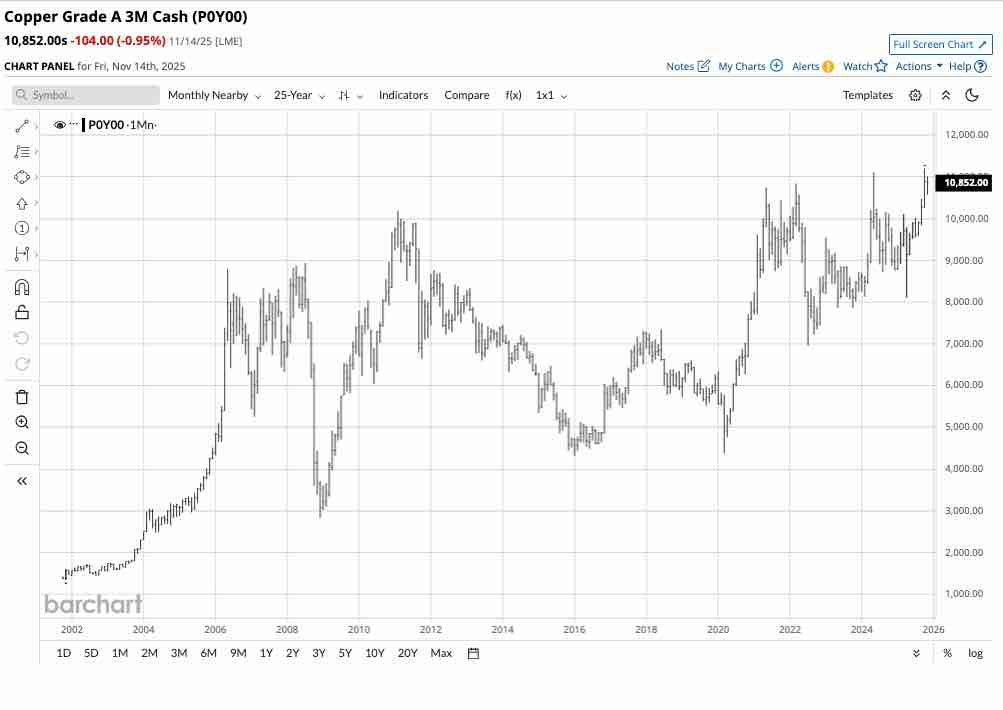 The twenty-five-year LME forward copper chart illustrates the bullish trend that took the red metal from $1,336 in November 2001 to the recent October 2025 record high of $11,200 per metric ton.