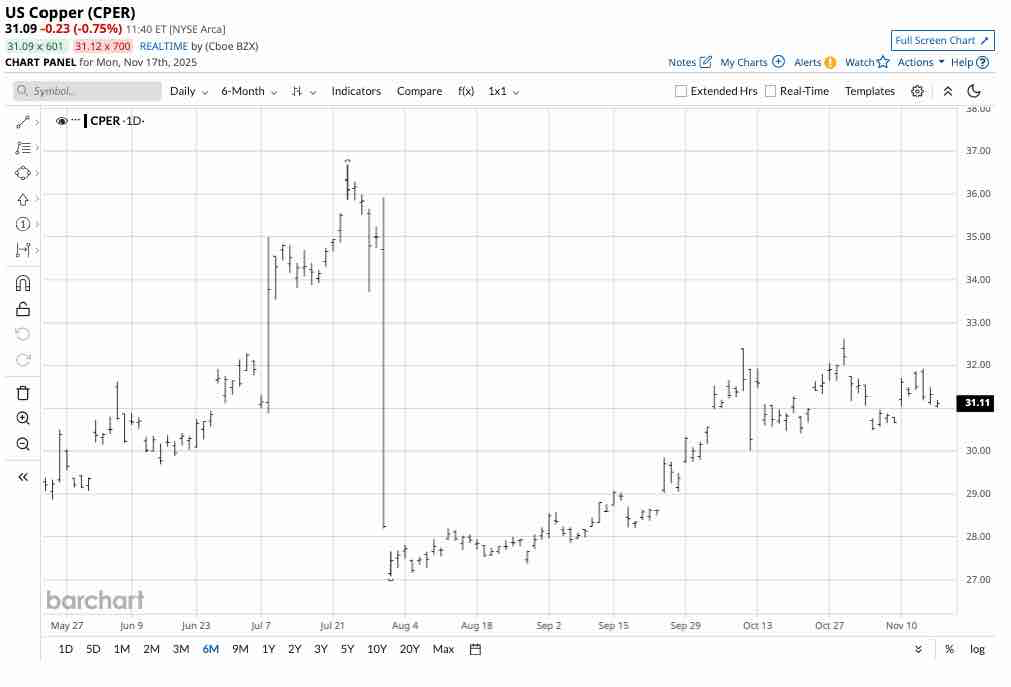 The U.S. Copper ETF (CPER) holds COMEX copper futures contracts. At $31.08 per share, CPER had over $330.4 million in assets under management. CPER trades an average of over 500,000 shares daily and charges a 1.06% management fee. The most recent rally in December COMEX copper futures took the price 19.8% higher from the July 31 low of $4.4055 to the October 29 high of $5.2790 per pound.