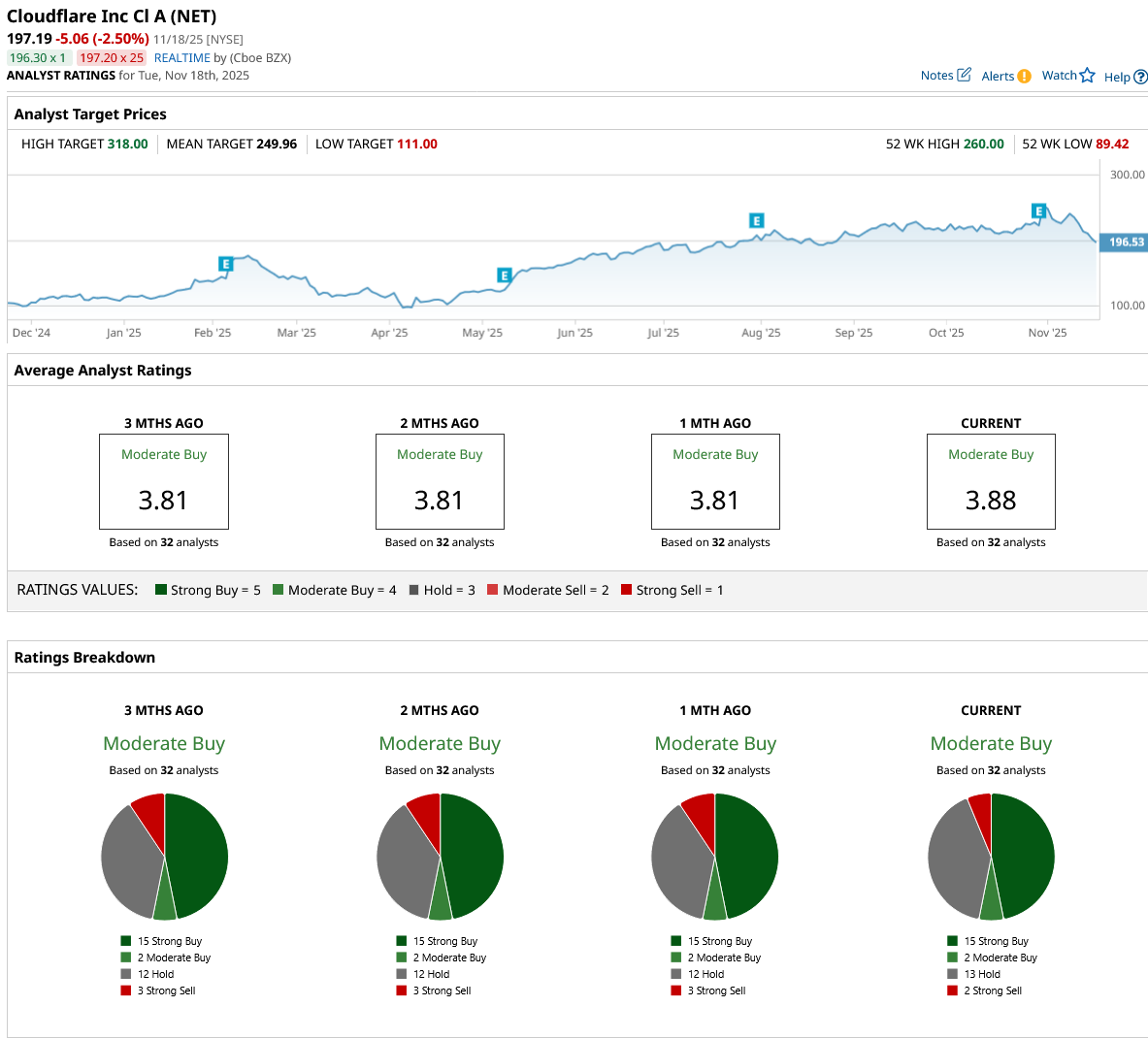 Analysts maintain a broadly positive outlook on NET stock, with a “Moderate Buy” rating consensus and a mean price target of $249.96, representing potential upside of roughly 27% from current levels. The highest analyst target sits at $318, while the lowest is $111, underscoring the degree of uncertainty tied to growth-stock multiples and execution consistency.