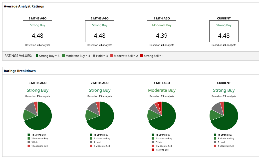 The stock has been rated by 23 analysts, receiving 16 “Strong Buy” ratings, 3 “Moderate Buy” ratings, 3 “Hold” ratings, and 1 “Moderate Sell” rating.