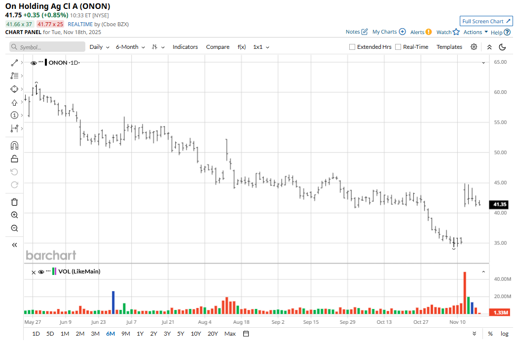 On Holding AG (ONON) is a leading Swiss sportswear company known for its innovative athletic footwear, apparel, and accessories designed for running, outdoor activities, and tennis. The brand is recognized for its proprietary CloudTec cushioning technology that delivers both comfort and high-performance support, attracting a dedicated following among athletes and fitness enthusiasts worldwide.