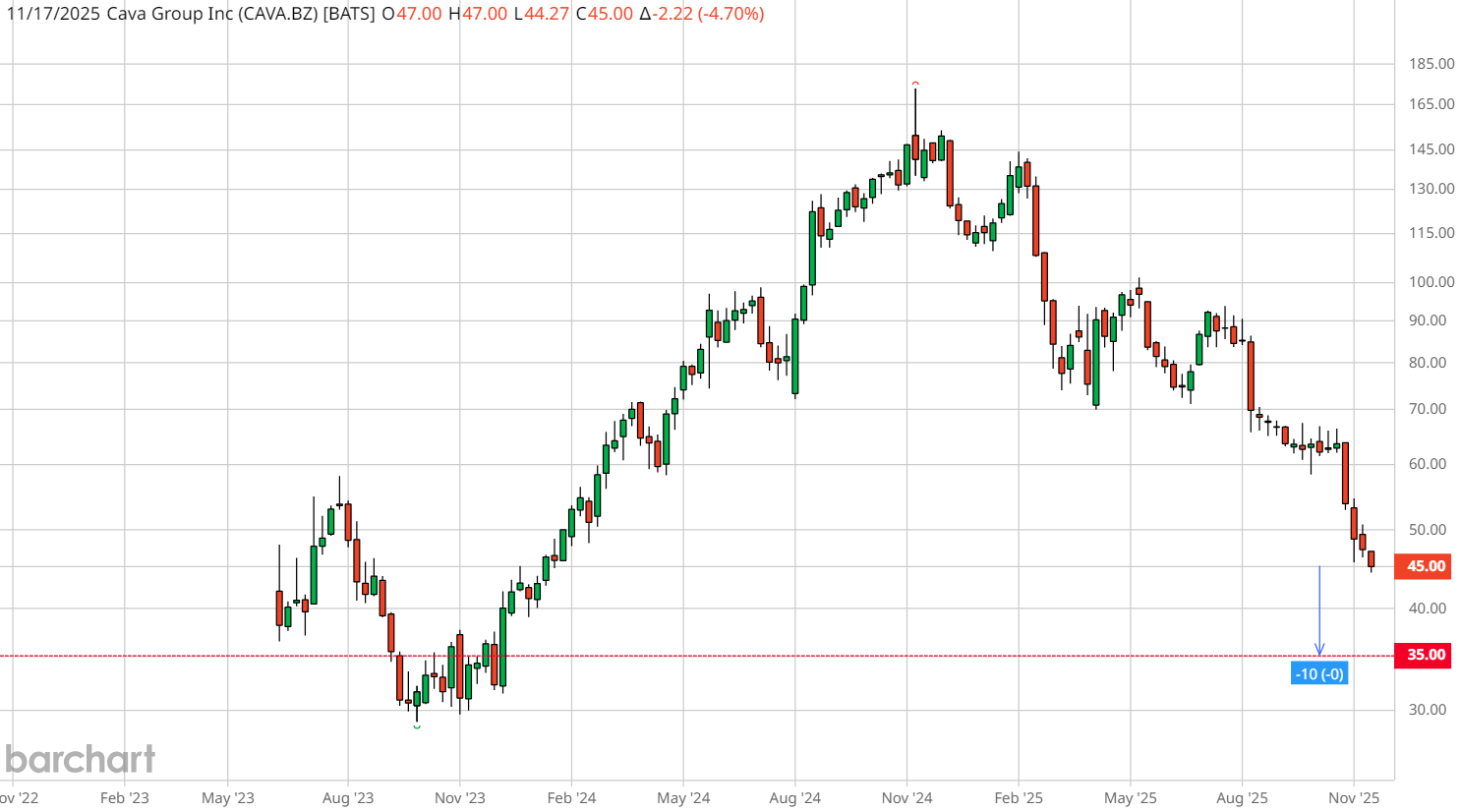 Restaurant stock Cava Group (CAVA) has underperformed dramatically this year, down 60% year-to-date as the major market benchmarks have set new record highs. CAVA’s stock price is down more than 28% over the past month alone, pressured by fears that a consumer crunch will leave the $15 salad store out in the cold. Are you buying this dip – or betting on more losses?