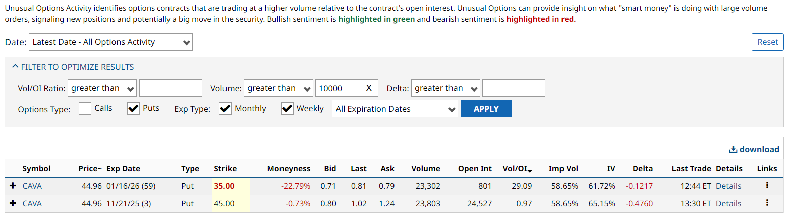 Based on the latest block trades, smart money is expecting additional downside for CAVA in the months ahead. Today, there was big unusual option activity at CAVA’s January 2026 35-strike puts, as volume of over 23,000 contracts hit the tape.