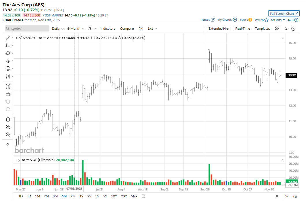 AES (AES) fits this backdrop as a high-yield pick with a 5.1% annual dividend yield. The Arlington, Virginia-based utility reported third-quarter 2025 results on Nov. 3 that showed a 30.6% rise in diluted earnings per share from the prior year, helped by new renewable projects and updated rates at its Indiana and Ohio utilities.