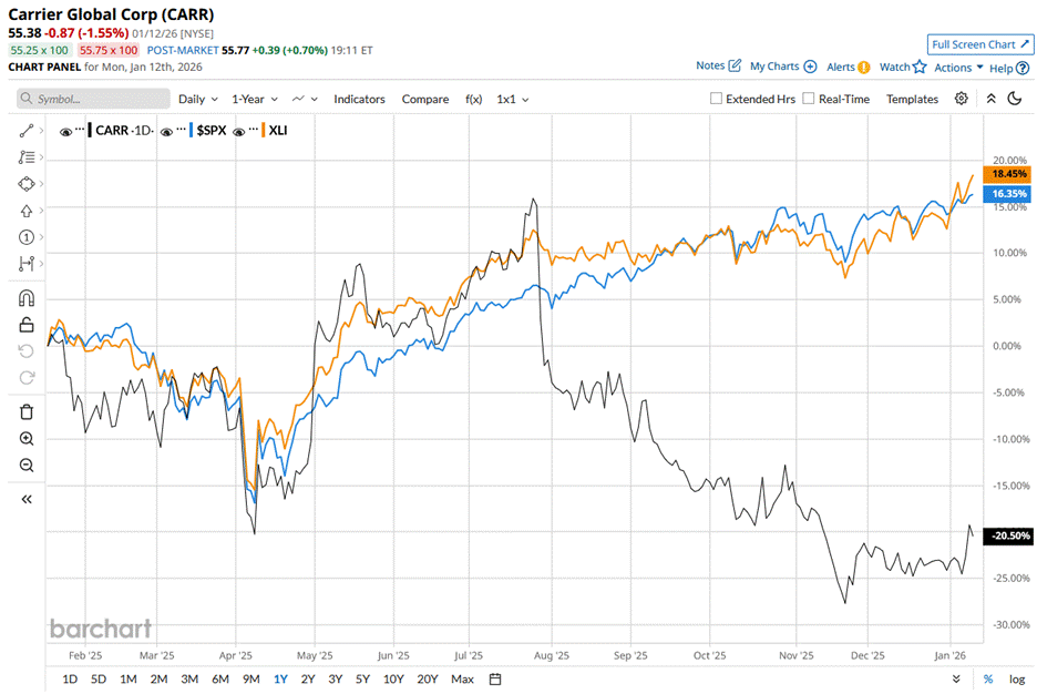 CARR stock has declined 16.7% over the past 52 weeks, underperforming the S&P 500 Index’s ($SPX) 19.7% rise and the State Street Industrial Select Sector SPDR ETF’s (XLI) 24.2% return during the same time frame.