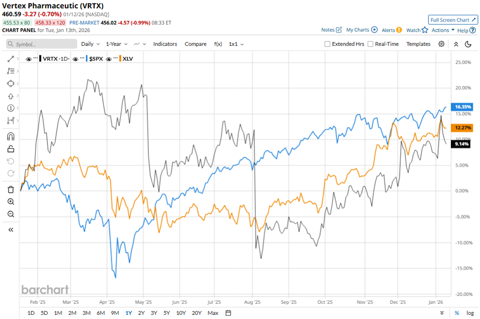 Shares of Vertex Pharmaceuticals have increased 11.8% over the past 52 weeks, lagging behind both the S&P 500 Index's ($SPX) 19.7% gain. However, the stock has slightly outpaced the State Street Health Care Select Sector SPDR ETF's (XLV) 11.3% return over the same period.
