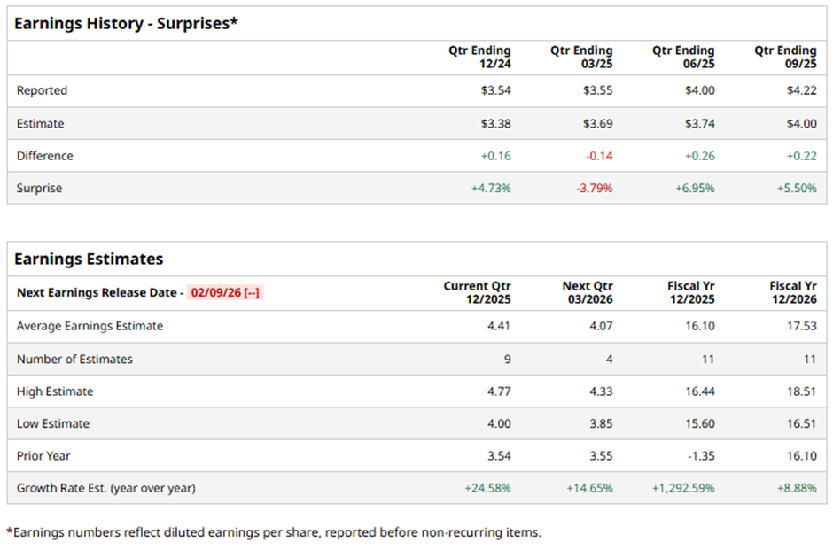The Boston, Massachusetts-based company is slated to announce its fiscal Q4 2025 results soon. Ahead of the event, analysts expect VRTX to report an adjusted EPS of $4.41, up 24.6% from $3.54 in the year-ago quarter. It has surpassed Wall Street's bottom-line estimates in three of the past four quarterly reports while missing on another occasion.