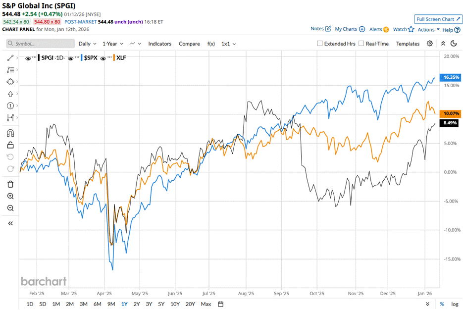 SPGI stock has surged 12.8% over the past 52 weeks, underperforming the S&P 500 Index’s ($SPX) 19.7% rise and the State Street Financial Select Sector SPDR ETF’s (XLF) 16.8% return during the same time frame.