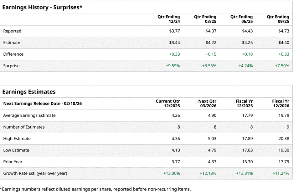 For the current year, analysts expect the company to report EPS of $17.79, up 13.3% from $15.70 in fiscal 2024. Moreover, its EPS is expected to rise by roughly 11.2% year over year (YoY) to $19.79 in fiscal 2026.
