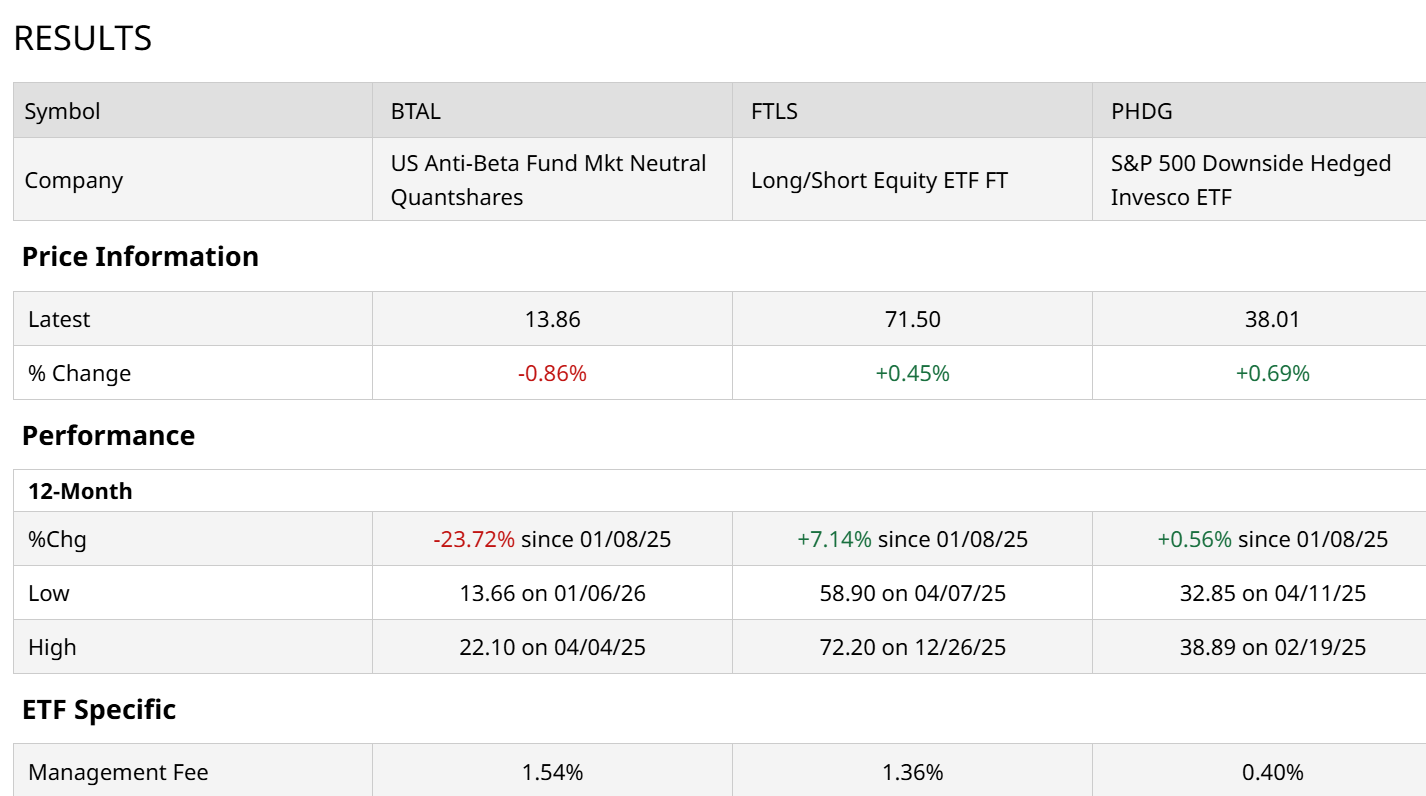 The US Anti-Beta Fund Market Neutral Quantshares (BTAL) is the most “pure insurance” play of the three. It goes long on boring, low-beta stocks and shorts the high-flying, high-beta names. When the market craters, BTAL usually shines because those “glamor” stocks fall much faster than the “defensive” ones. You own this when you’re convinced a bubble is about to burst. Or, if you simply want something to go counter to what most investors and traders have heavy exposure to currently, like tech and other high-beta names.