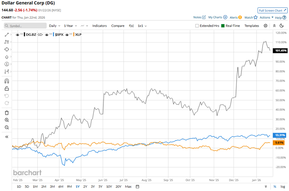 Shares of Dollar General have jumped 104.5% over the past 52 weeks, significantly outperforming both the S&P 500 Index's ($SPX) 13.6% gain and the State Street Consumer Staples Select Sector SPDR ETF’s (XLP) 6.5% rise over the same period.