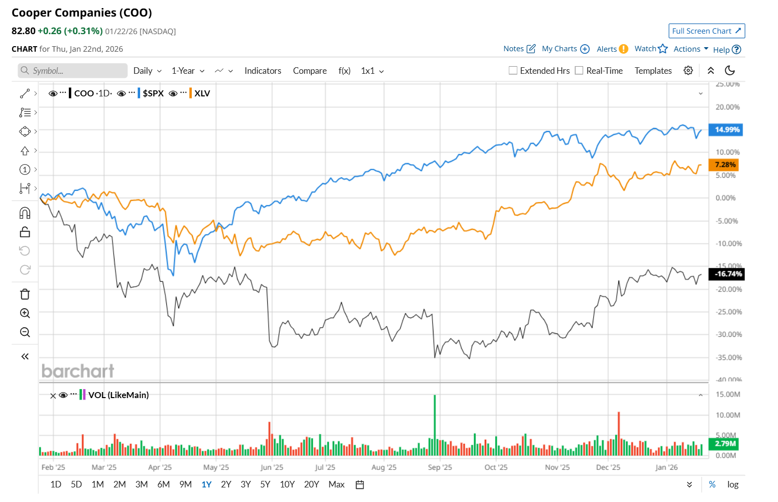 COO has declined 13% over the past 52 weeks, notably underperforming both the S&P 500 Index's ($SPX) 13.6% return and the State Street Health Care Select Sector SPDR ETF’s (XLV) 11.3% uptick over the same time period.