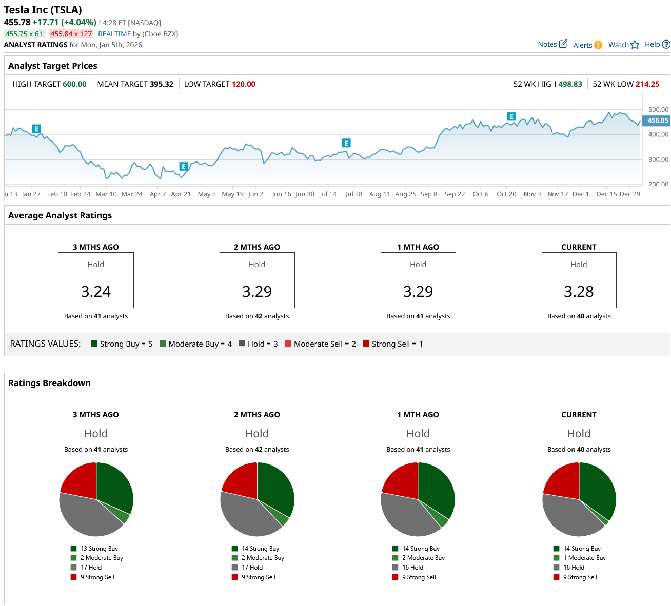 That brings the conversation naturally to how the Street is framing the stock right now, as 40 analysts surveyed on TSLA land on a consensus “Hold” rating. The average price target across that group is $395.32, which is actually below its current price and implies roughly 13% downside from here, not upside.