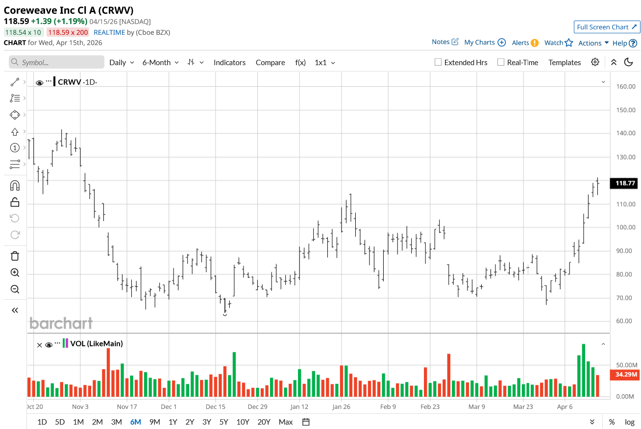 CRWV stock has significantly outperformed the S&P 500 Index ($SPX) over the past year. While the index delivered returns of around 30%, the stock generated gains roughly five times higher during the same time. So far this year, the stock is closing in on 70% gains.