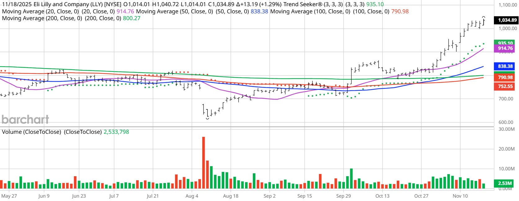 Eli Lilly hit an all-time high of $1,045.60 in morning trading on Nov. 19.