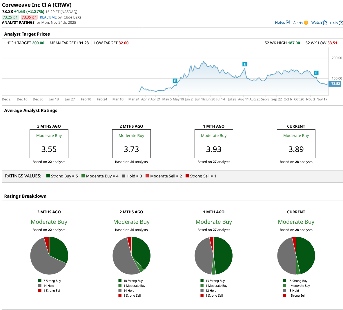 Out of the 28 analysts covering CRWV stock, 13 recommend “Strong Buy,” one recommends “Moderate Buy,” 13 recommend “Hold,” and one recommends “Strong Sell.” The average CRWV stock price is $131.23, above the current price of $73.