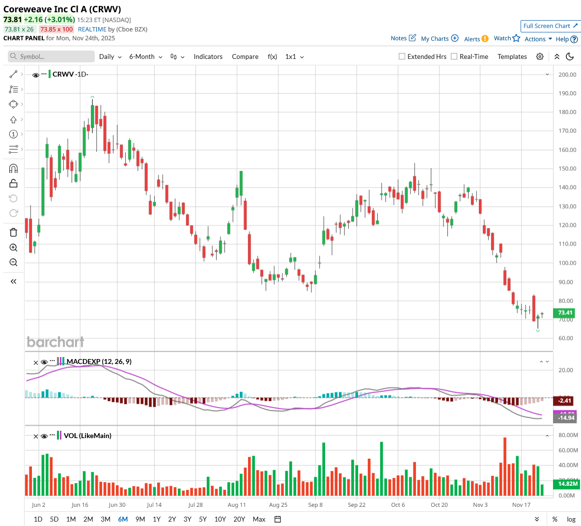CoreWeave rents Nvidia chips to companies building AI systems and counts major cloud providers like Google (GOOG) (GOOGL) and Microsoft among its customers. The business model has proven wildly successful, with CoreWeave securing huge contracts during Q3. OpenAI expanded its relationship by $6.5 billion, while Meta signed a deal potentially worth $14.2 billion over six years.