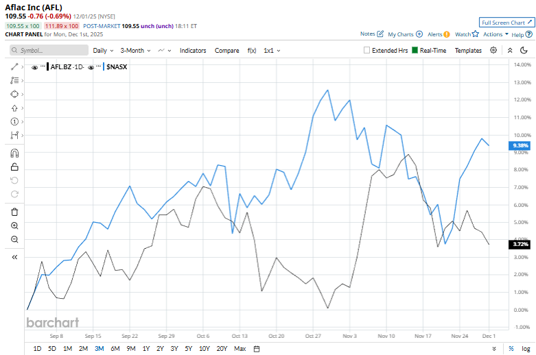 AFL touched its all-time high of $115.83 on Nov. 14, and is currently trading 5.4% below that peak. Meanwhile, AFL stock has observed a 2.5% uptick over the past three months, lagging behind the Nasdaq Composite’s ($NASX) 8.5% rise during the same time frame.