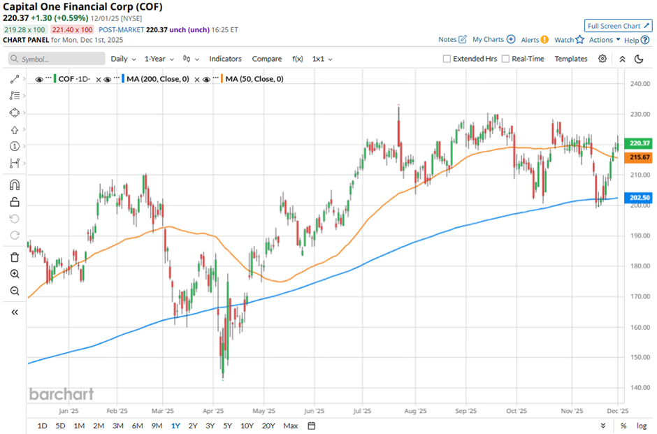 With a market cap of $139.3 billion, Capital One Financial Corporation (COF) is a financial services holding company that oversees Capital One, National Association, offering a wide range of financial products and services across the U.S., Canada, and the U.K. It operates through three main segments: Credit Card, Consumer Banking, and Commercial Banking, providing deposit accounts, loan products, and advisory and treasury services.