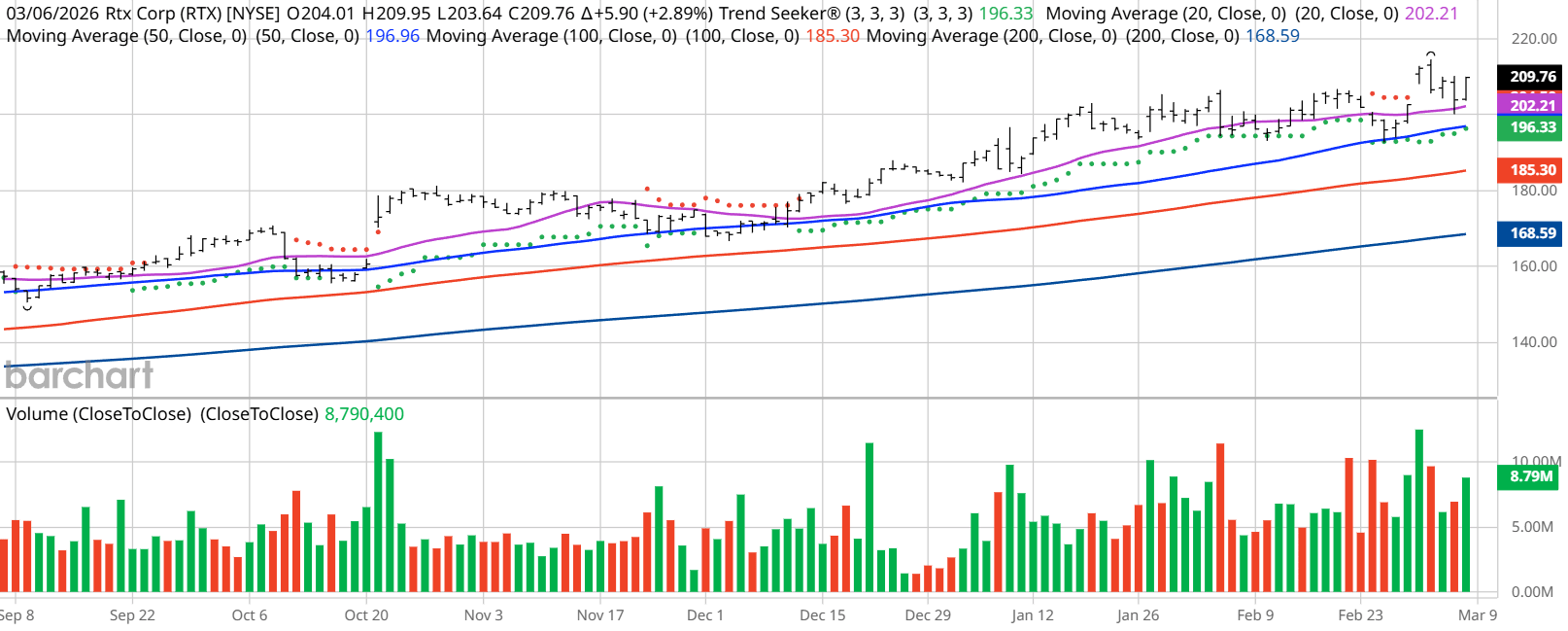 - RTX (RTX) recently hit new all-time highs of $214.50 and has robust technical momentum.
