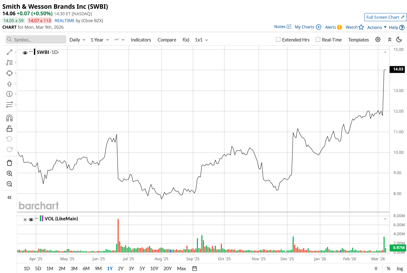 Smith & Wesson Brands (SWBI) reported its fiscal third-quarter results on Friday, easily topping Wall Street expectations and igniting a powerful rally in its shares. The stock surged 18% in a single session, propelling it to a fresh 52-week high as investors cheered signs of renewed strength in the firearms giant’s core handgun business. Even as broader industry demand softened, SWBI’s handgun sales surged, suggesting the company is steadily stealing market share from smaller rivals.