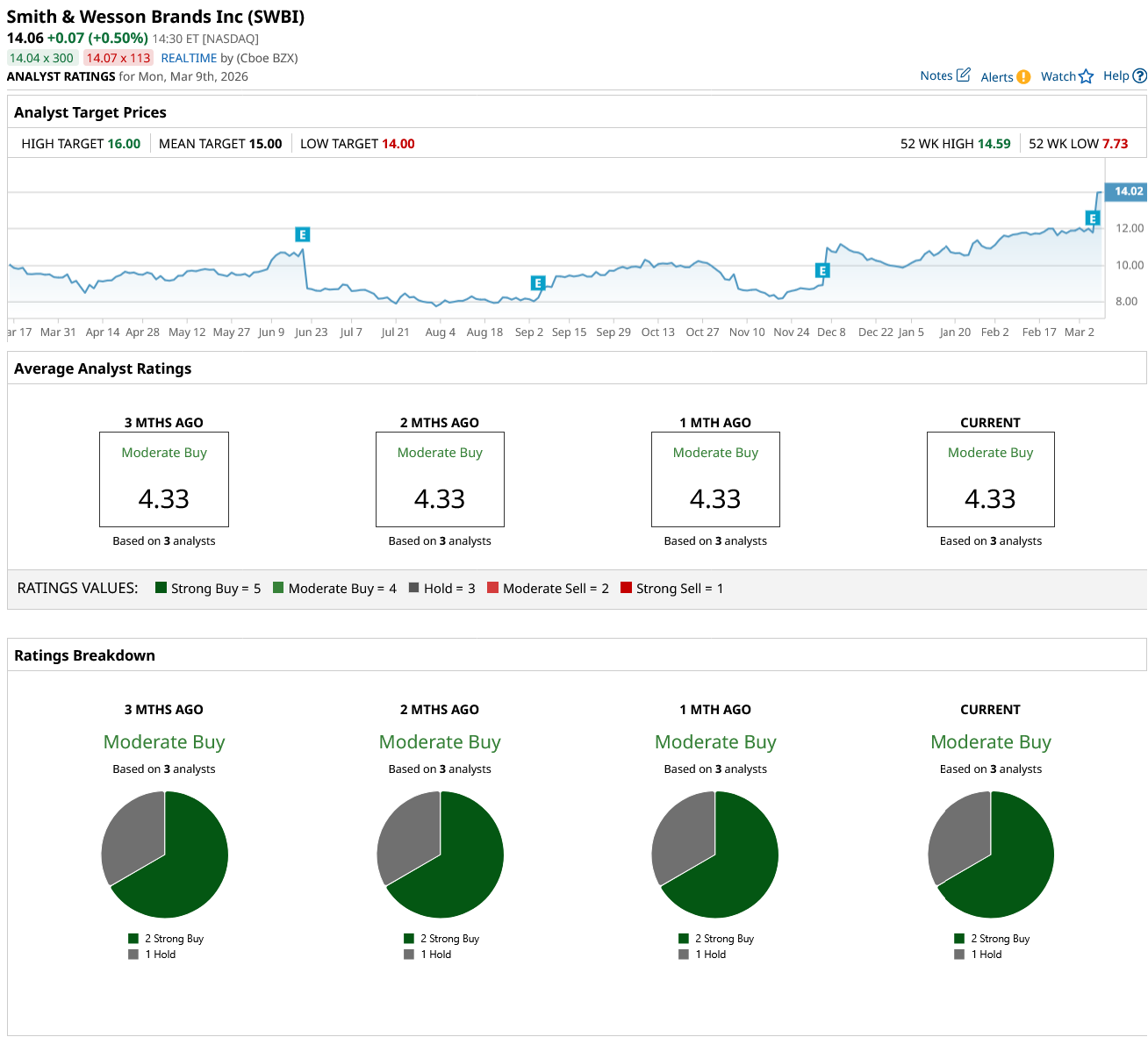 Wall Street attention is surprisingly thin for a company of SWBI’s size. Barchart data shows just three analysts covering the stock, all maintaining a “Moderate Buy” consensus, with a mean price target of $15, implying 7% upside potential.