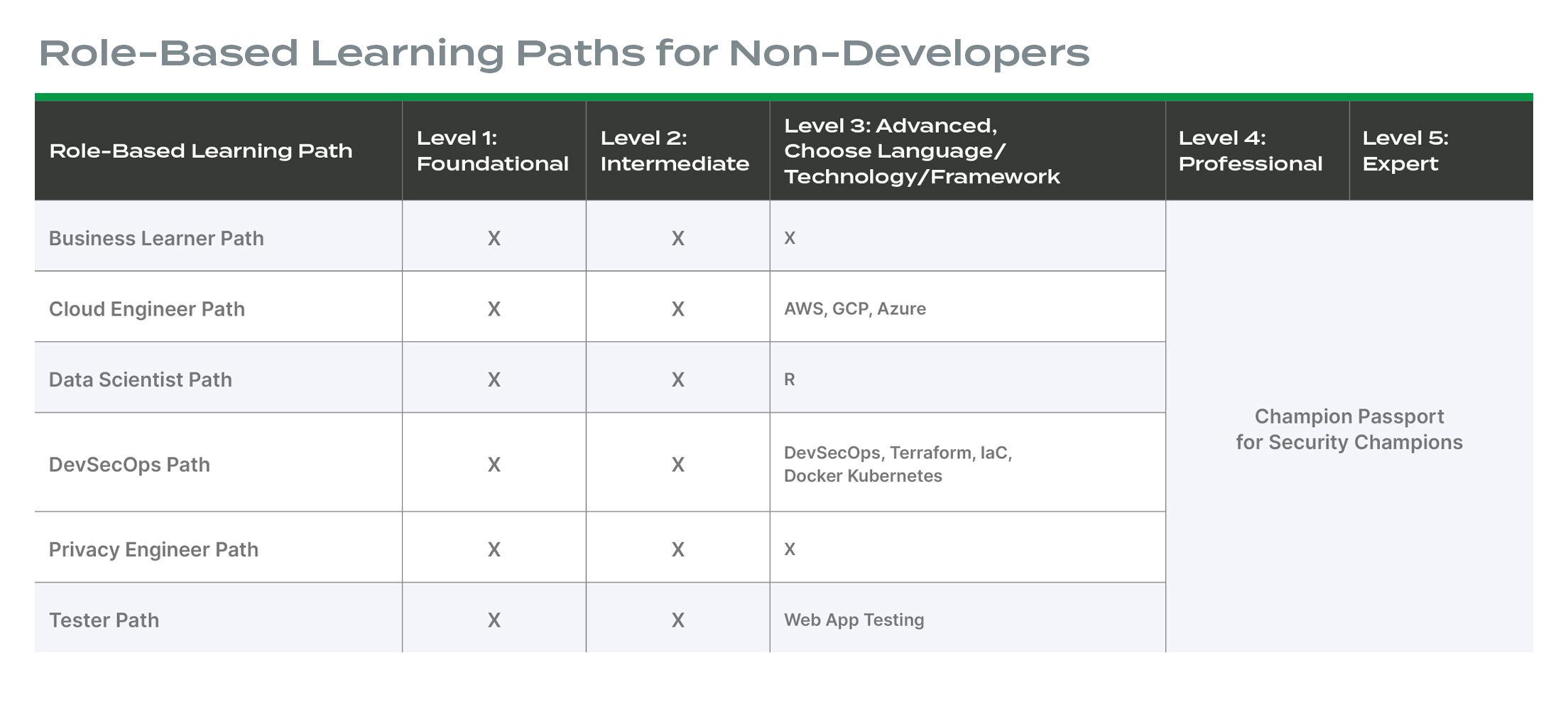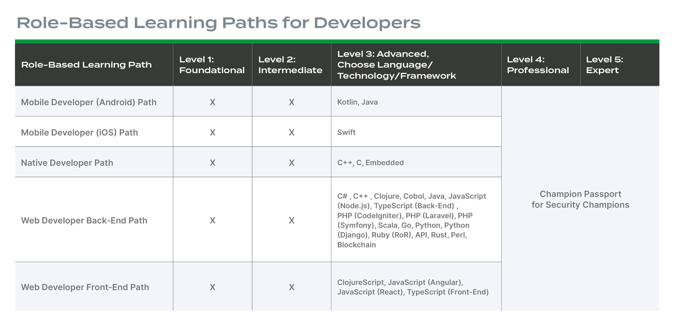 Role-Based Learning Paths have been selected for each of the key roles involved in developing software. Each path has three levels of learning that build progressively: Foundational, Intermediate and Advanced. Each level within a learning path contains 24 or fewer lessons, with learners rewarded with a certificate at the end of each level.